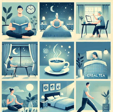 แสงสีฟ้า (blue light) ที่ปล่อยออกมาจากโทรศัพท์ แท็บเล็ต และคอมพิวเตอร์สามารถรบกวนการผลิตเมลาโทนิน ซึ่งเป็นฮอร์โมนที่ควบคุมการนอนหลับ - ไม่ควรบริโภคคาเฟอีนและแอลกอฮอล์