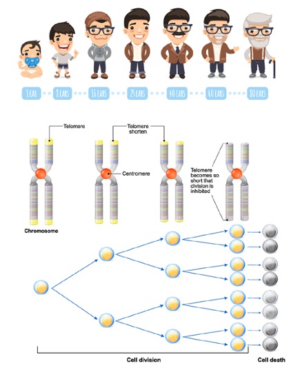 ในปัจจุบันเป็นที่รู้ว่าการหดสั้นลงของเทโลเมียร์มีความสัมพันธ์กับการแก่ตัวของเซลล์ (Cellular aging) โดยความยาวของเทโลเมียร์เมื่อแรกคลอดจะมีความยาวอยู่ที่ประมาณ 10,000 bp และหดสั้นลงเรื่อย ๆ เมื่ออายุเพิ่มมากขึ้น พบว่าความยาวเฉลี่ยของเทโลเมียร์ของเซลล์เม็ดเลือดขาวมีความสัมพันธ์กับโรคที่มีความเกี่ยวข้องกับผู้สูงอายุ เช่น Atherosclerosis, Myocardial infarction, Alzheimer’s disease ความดันโลหิตสูง และ ความเสี่ยงในการเกิดโรคเบาหวาน ในตัวอย่างเช่นกลุ่มผู้ที่มีอายุมากกว่า 100 ปี (Centenarian) จะพบความยาวเฉลี่ยของเทโลเมียร์สูงกว่าค่าที่คาดไว้ และในกลุ่มที่มีสุขภาพดีจะมีค่าความยาวเฉลี่ยของเทโลเมียร์ที่ยาวกว่ากลุ่มที่มีโรคต่าง ๆ ที่เกี่ยวข้องกับความชรา นอกจากนั้นในผู้ที่มีความยาวเฉลี่ยของเทโลเมียร์จากเซลล์เม็ดเลือดขาวสั้นนั้น จะเพิ่มความเสี่ยงในการเป็นโรคมะเร็งมากขึ้น และยังพบว่าอัตราการตายที่เกิดจากมะเร็งในผู้ที่มีความยาวเฉลี่ยของเทโลเมียร์สั้นนั้นสูงกว่ากลุ่มที่มีเทโลเมียร์ยาวกว่าอย่างมีนัยยะสำคัญ ปัจจัยในการใช้ชีวิตหลายปัจจัยก็มีส่วนในการหดสั้นลงของเทโลเมียร์ ทำให้มีการศึกษาอายุทางชีวภาพซึ่งอาจมีความสำคัญในการแสดงถึงความเสี่ยงทางด้านสุขภาพในรายบุคคล ซึ่งก่อนหน้านี้อาศัยความสัมพันธ์กับอายุตามปีปฏิทิน จากความยาวของเทโลเมียร์ที่แสดงถึงความสัมพันธ์ทั้งทางตรงและทางอ้อมต่อพฤติกรรมการใช้ชีวิต หรือ สภาวะสุขภาพ ทำให้ความยาวของเทโลเมียร์น่าจะมีความสามารถในการทำหน้าที่เหมือนตัวบ่งชี้ทางชีวภาพ (Biomarker) ที่จะช่วยในการประเมินความเสี่ยงทางด้านสุขภาพ (Lapham K. et.al. 2015, Lin J. et.al. 2012, Sanders J.L. et.al. 2013) ดังนั้นเพื่อติดตามความเปลี่ยนแปลงความยาวของเทโลเมียร์ควรตรวจประจำปีละครั้ง ในการดูอัตราการสั้นลงของเทโลเมียร์ เพื่อเป็นแนวทางการรักษาที่เหมาะสม ในการชะลอ และป้องกันการหดสั้นลงของเทโลเมียร์ได้อย่างมีประสิทธิภาพ เช่นการปรับเปลี่ยนพฤติกรรมการนอน การออกกำลังกาย การรักษาระดับความเครียด รวมถึงการรับสารอาหารต่างๆ อีกด้วย